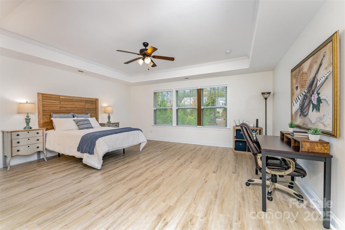Space, flexibility, and a layout that fits real life—this 6-bedroom, 4-bath home delivers all three in the amenity-rich Lakewalk community at Lake Norman. Set on a nicely landscaped lot, the home offers generous square footage and versatile rooms suited for today’s needs, including layouts that adapt well to multi-generational living. The rocking-chair front porch opens to a wide foyer flanked by an open formal dining room and a dedicated office. The main level features hardwood flooring, a full guest suite, and a bright great room with a stone fireplace. The gourmet kitchen includes double ovens, gas cooktop, French-door refrigerator, abundant cabinetry with granite countertops, a large island, walk-in pantry, and a breakfast area that ties the main floor together. Upstairs, new 2024 LVP flooring extends through five bedrooms, including the spacious primary suite with an oversized walk-in closet and a well-appointed bath with dual granite vanities, soaking tub, and separate shower. The versatile bonus/6th bedroom includes a closet and works well as a media room, fitness area, studio, or additional bedroom—supporting flexible or extended living arrangements. The backyard features a screened porch, brick paver patio, built-in fire pit, fenced yard, and full irrigation. Lakewalk amenities include a pool and clubhouse, pickleball courts, playground, picnic pavilion, dog park, sidewalks, walking trails, and Lake Norman access for kayaking and paddleboarding. Convenient to I-77, shopping, dining, and Lakeshore/Lake Norman schools.
