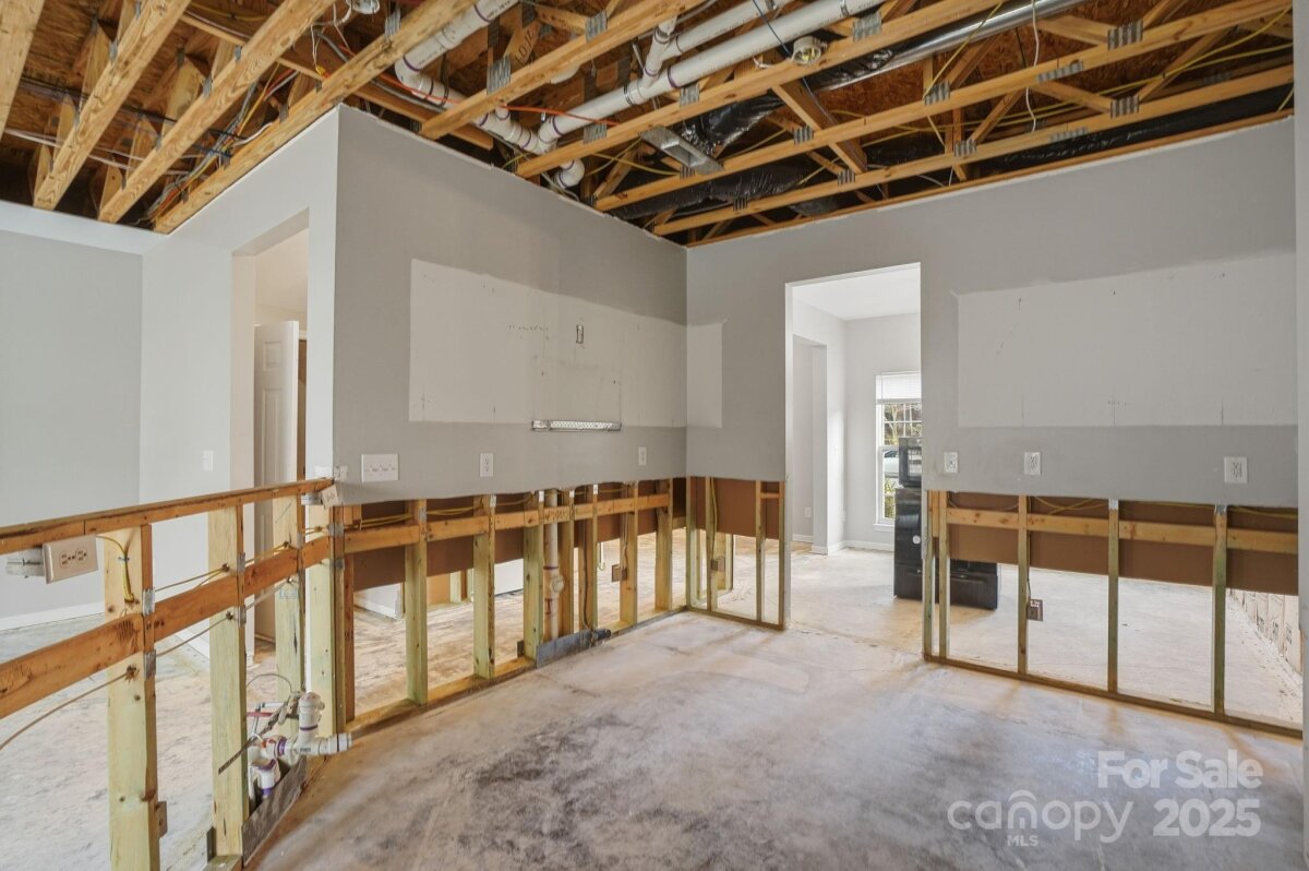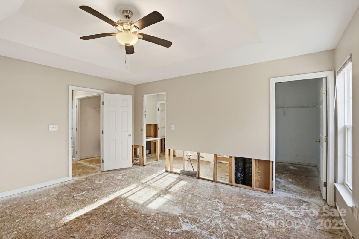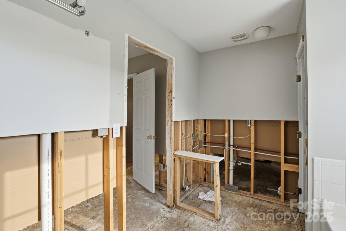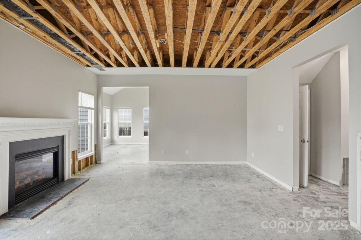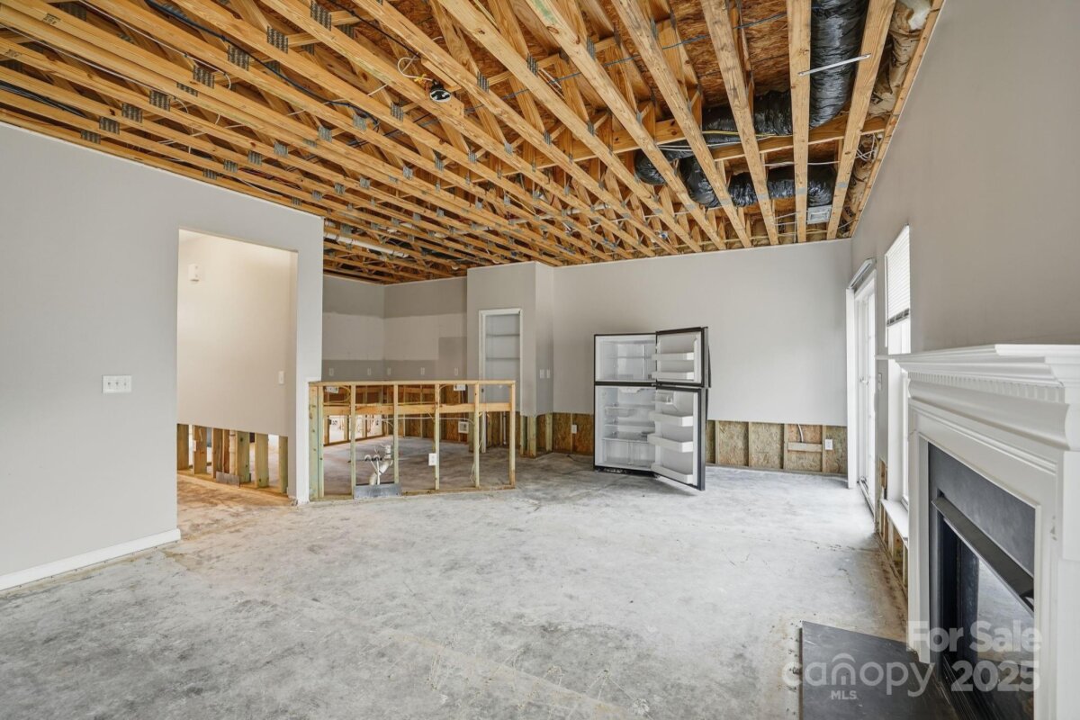 Two-story home with 3 bedrooms, 2.5 bathrooms, and a 2-car garage. The living room features a fireplace, and the home offers a spacious layout with a large wood-fenced backyard. Interior areas require significant renovation—sections of walls and ceilings are stripped to the studs, flooring is down to the slab, and cabinets, counters, sinks, and vanities are missing in the kitchen and bathrooms. Property is being sold as is and presents a strong opportunity for restoration or investment. Cash or hard money only.