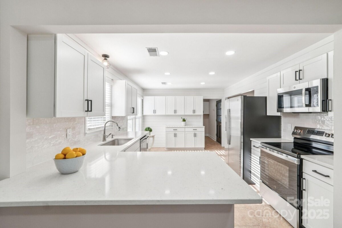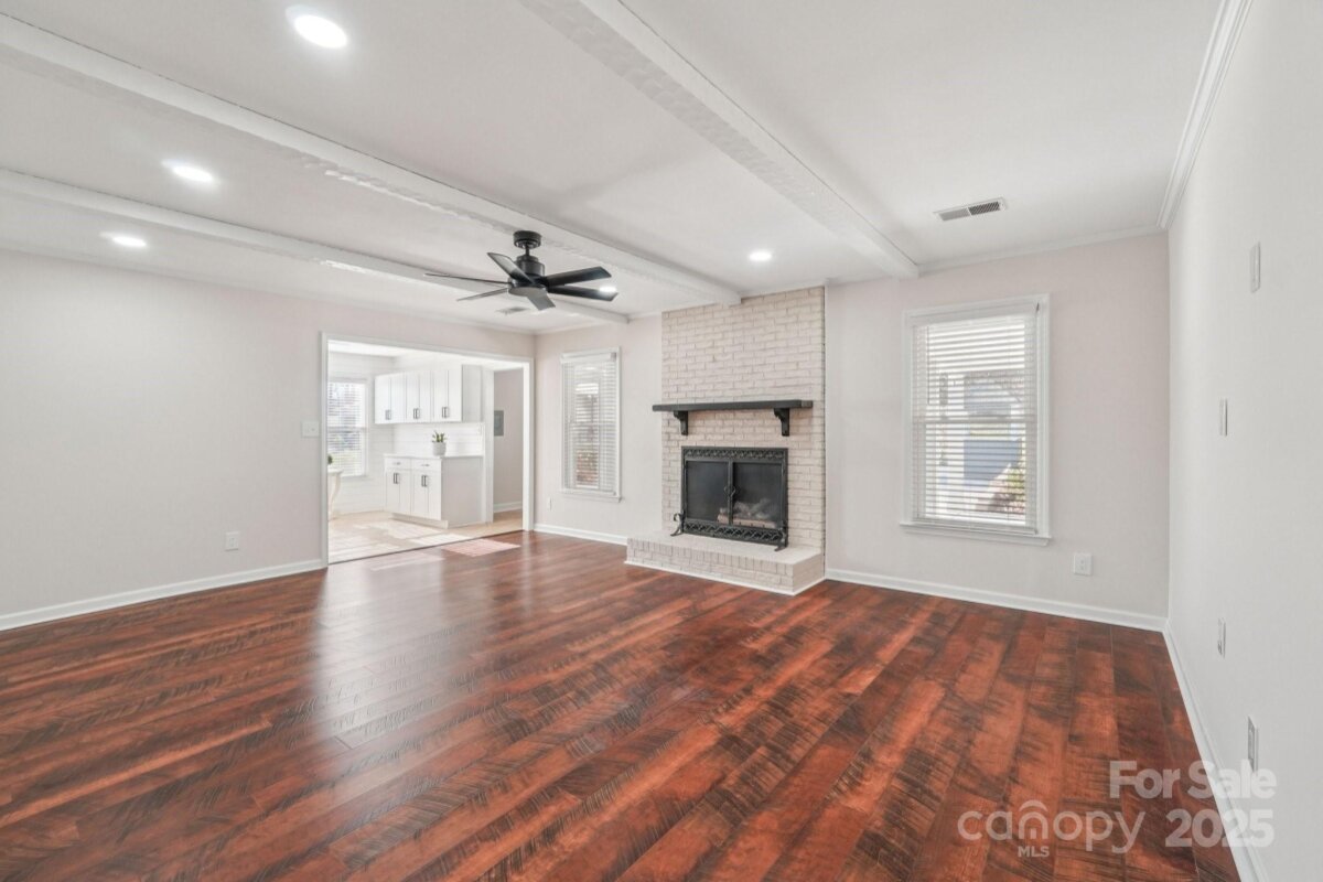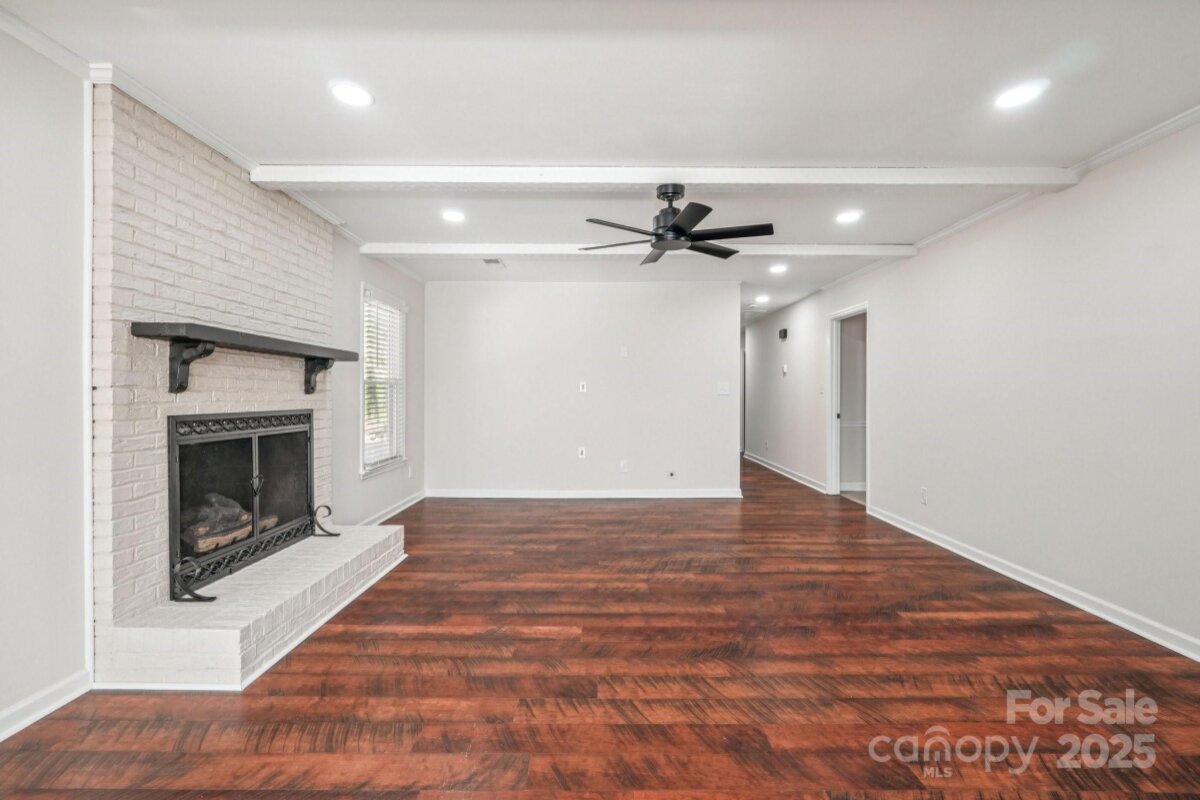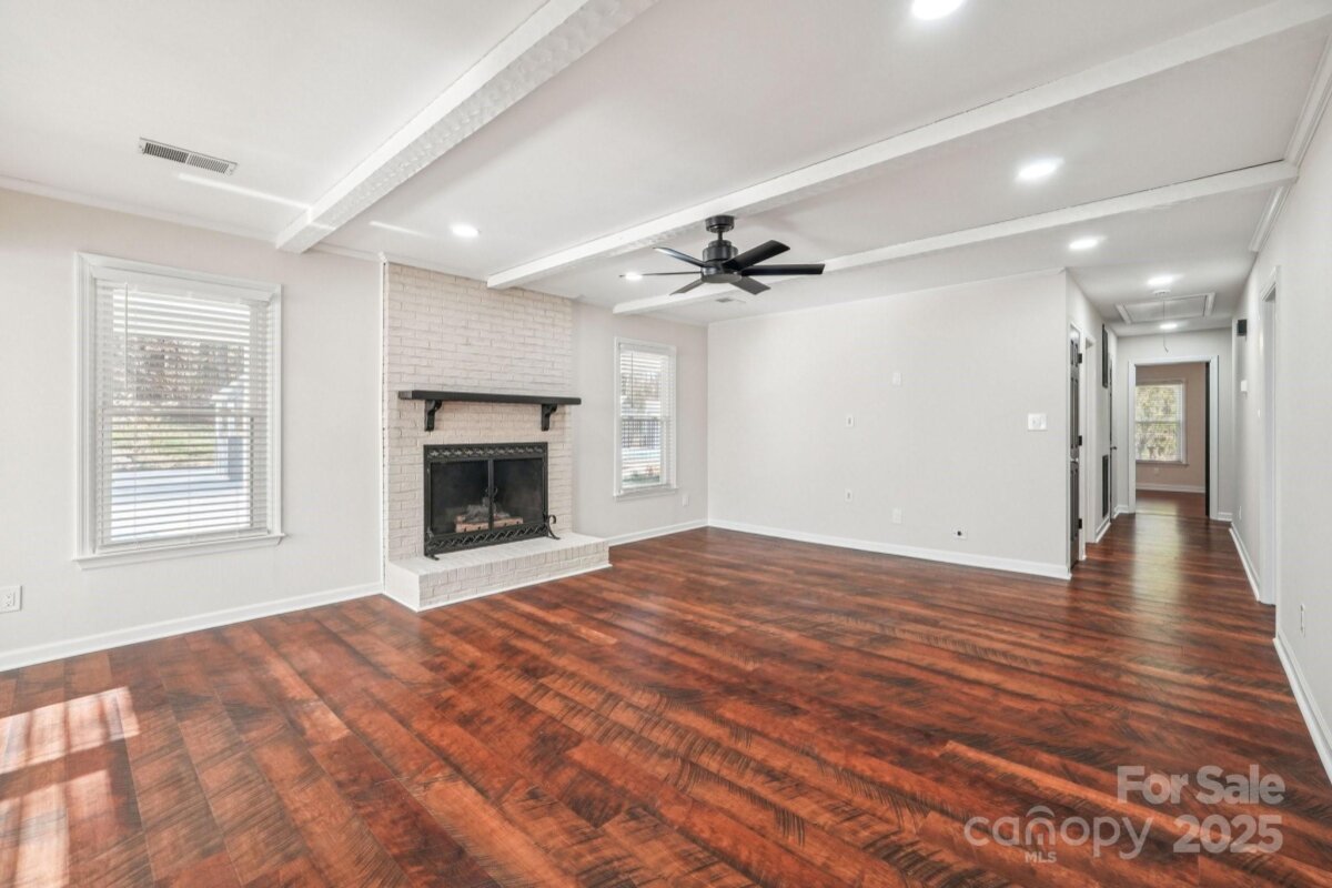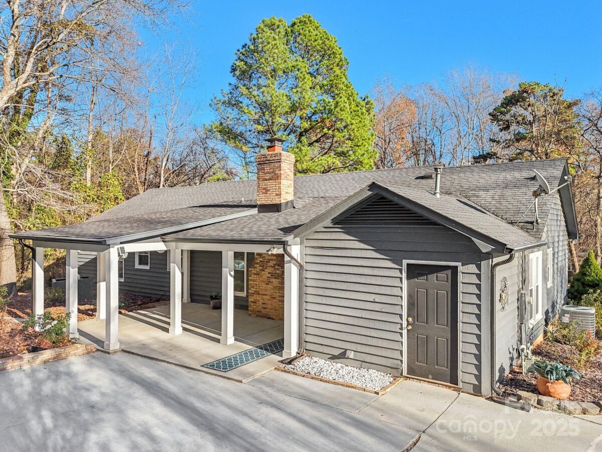 Welcome to this charming move-in ready ranch home, featuring a spacious extended front porch ideal for gathering with friends or simply enjoying the outdoors. Thoughtful details including hooks for hanging baskets, ceiling fans for added comfort, and safety gate enhance both style and functionality. Inside, the living room sits just off the foyer and showcases oversized windows that flood the space with natural light along with a warm wood accent wall. The living room flows seamlessly into the formal dining area, which is separated from the kitchen by a convenient breakfast bar. The recently upgraded kitchen impresses with new stainless-steel appliances, new gleaming Silestone countertops, new crisp white cabinetry, and charming shiplap accents and new contemporary light fixture. The open-concept layout continues into the inviting great room anchored by a beautifully painted brick fireplace and highlighted by wood beam ceiling accents - an ideal setting for relaxing or entertaining. Two generous bedrooms sit at the front of the home and share an updated full bath. The primary suite offers exceptional comfort with two spacious closets and a private ensuite bath featuring a floor-to-ceiling tiled shower. The backyard is an outdoor oasis offering an extended covered patio with a ceiling fan, and a fully fenced pool with ample space for lounge seating, outdoor dining, and sunny-day fun. All of this is just minutes from I-485, ensuring an easy and convenient commute.