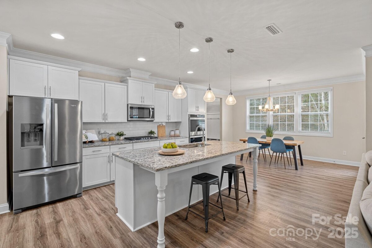 Welcome to this stunning home featuring an open floor plan perfect for modern living. The spacious living room offers a cozy fireplace and flows seamlessly into the gorgeous kitchen, complete with all stainless-steel appliances—including a double oven, gas cooktop, built-in microwave, dishwasher, and refrigerator. A large island with a breakfast bar makes this kitchen an ideal gathering spot. Just off the main living area is a private office with French doors, perfect for working from home. A convenient drop zone adds extra functionality near the entryway. This home offers four bedrooms, three full baths, and one half bath, including generous bedroom spaces for everyone. The large laundry room provides excellent storage and convenience. Enjoy outdoor living on the covered patio overlooking the fenced-in backyard—perfect for relaxing or entertaining. Located in the desirable Meadows at Coddle Creek, this community features wonderful amenities, including a pool, playground, and walking trails.