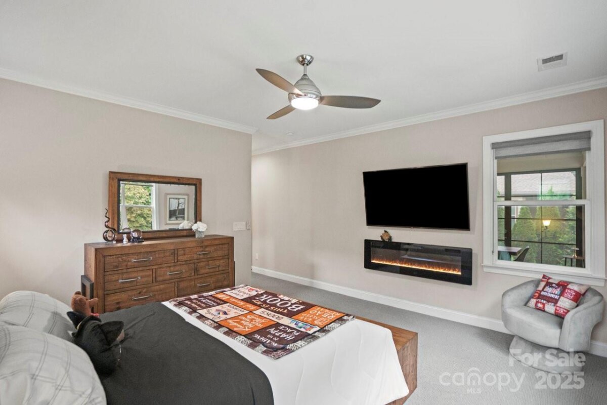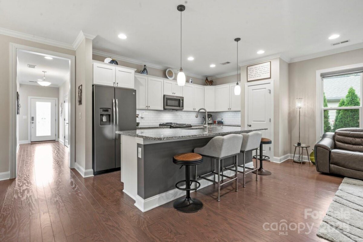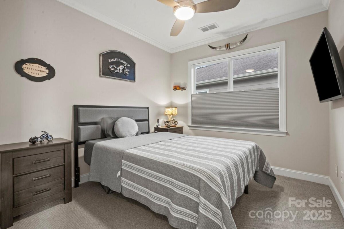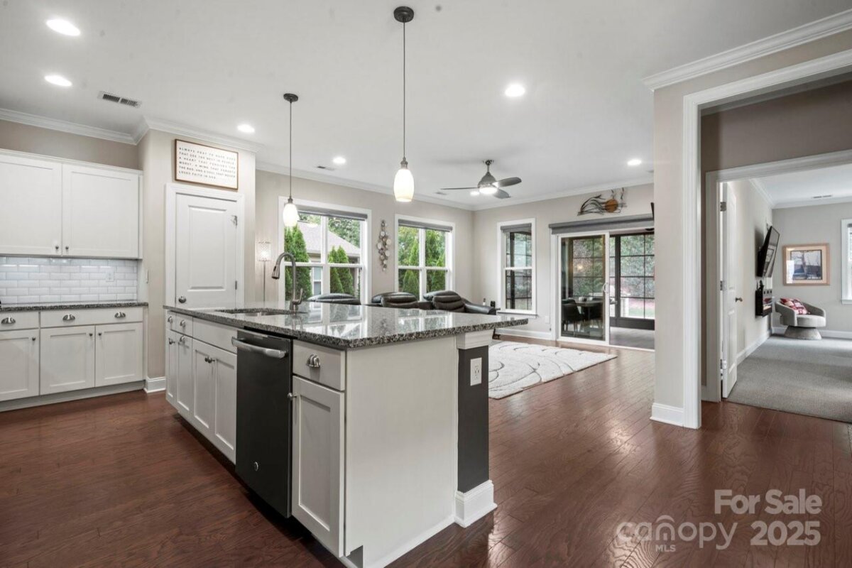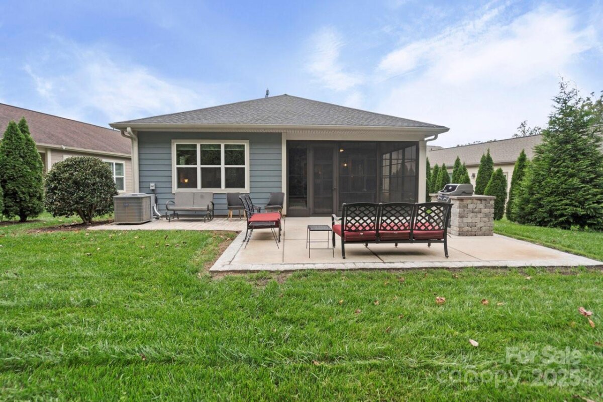 Move in ready, private lot and immaculately maintained, this light and bright split 2BR, 2BA home features a well-appointed kitchen anchoring the main living area. SS appliances, granite countertops, tile backsplash, beautiful light craftsman style cabinetry, under/over cabinet lighting, island breakfast bar, refrigerator and pantry. Large dining area adjacent to the great room which is highlighted with an electric fireplace and sliding glass doors that open to the EZE Breeze/screened lanai (heated/cooled) that flows to an extended paver patio with private wooded natural views. A serene primary suite completes this home also features an electric fireplace and ensuite bath with dual sink vanity, generous walk-in custom closet and tiled shower. Crown molding, newer carpet, custom blinds, low maintenance wood and tile floors throughout the home. Refrigerator, washing machine/gas dryer (both brand new), window treatments, 3 wall mounted televisions, 2 wall mounted electric fireplaces, gas grill all remain. 1 car extended garage has additional space for a golf cart & storage plus a widened driveway for ease of use. Gutter covers for easy exterior leaf maintenance. Trilogy Membership includes Freedom Boat Club on Lake Norman plus award winning amenities.