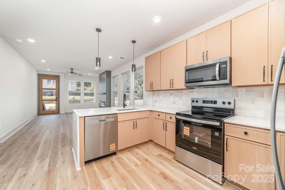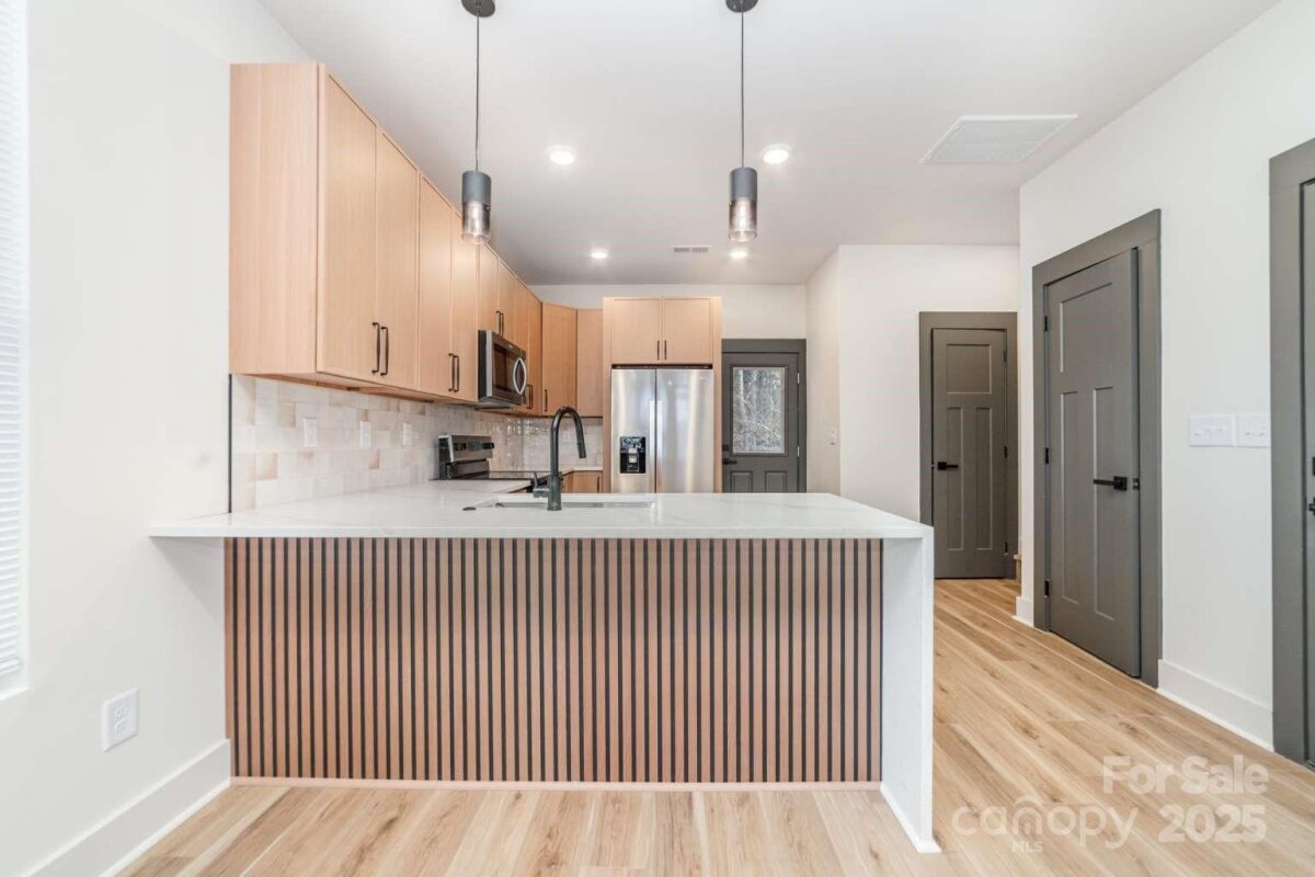 Discover modern living in this stunning French-inspired home offering over 1,400 sq ft of beautifully designed space. Step into an open layout featuring quartz countertops, sleek finishes, and an elegant electric fireplace that adds warmth and style. The huge primary suite provides a true retreat with generous space and custom tile work throughout. Enjoy the convenience of a one-car garage, included appliances, and thoughtful details in every room. Outside, relax or entertain on the oversized deck surrounded by nature, creating a private, peaceful atmosphere. Located minutes from downtown Kannapolis and within walking distance to A.L. Brown High School, this home blends comfort, design, and accessibility—perfect for modern living.