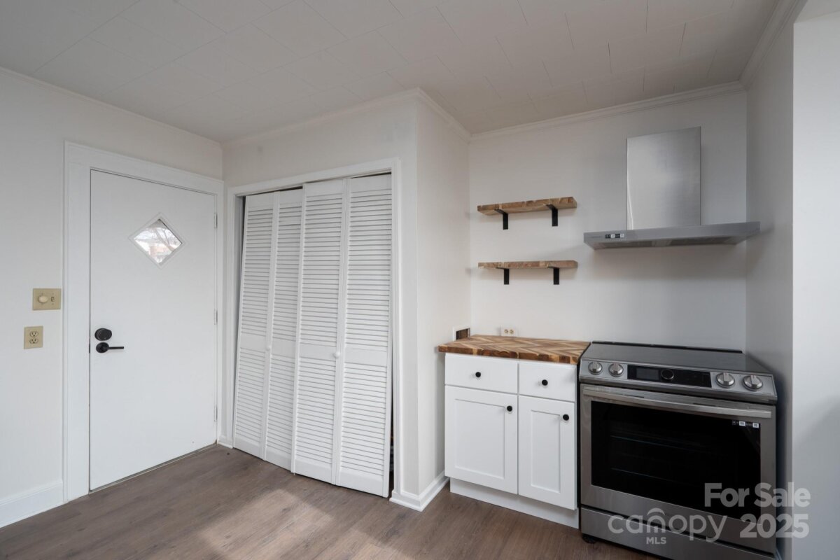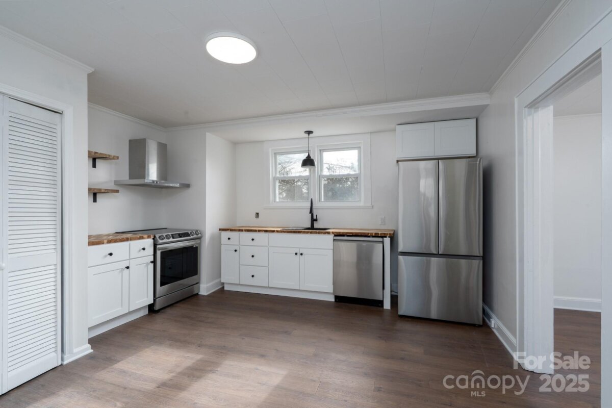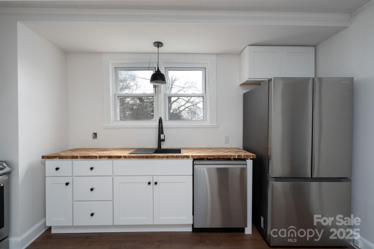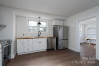 Welcome to this charming historic home in American and Efird Mills neighborhood. Built in 1910, this home offers architecture that is timeless with many wonderful updates! Enjoy a large, fully renovated kitchen featuring all-new stainless steel appliances, a newly added dishwasher and disposal, new cabinets, butcher block countertops, and Pergo waterpoof laminate flooring. Laundry is currently located in the garage, but there is a hookup in the kitchen closet. The dining room is freshly painted, with Pergo waterproof laminate flooring and updated light fixture. Two bedrooms are comfortable in size, and the well-appointed bathroom includes a new vanity, toilet, light fixture and LVT flooring. There is great flow for entertaining into large living room, which features original hardwoods. Not only does the property offer a carport with garage, but there is an extra-large garage workshop that has its own water heater and meter for laundry, as well as a hookup for a potential future bathroom. The electrical panel for the main house was updated in 2023. This home is conveniently located to downtown Albemarle - super cute and ready for its new owner!