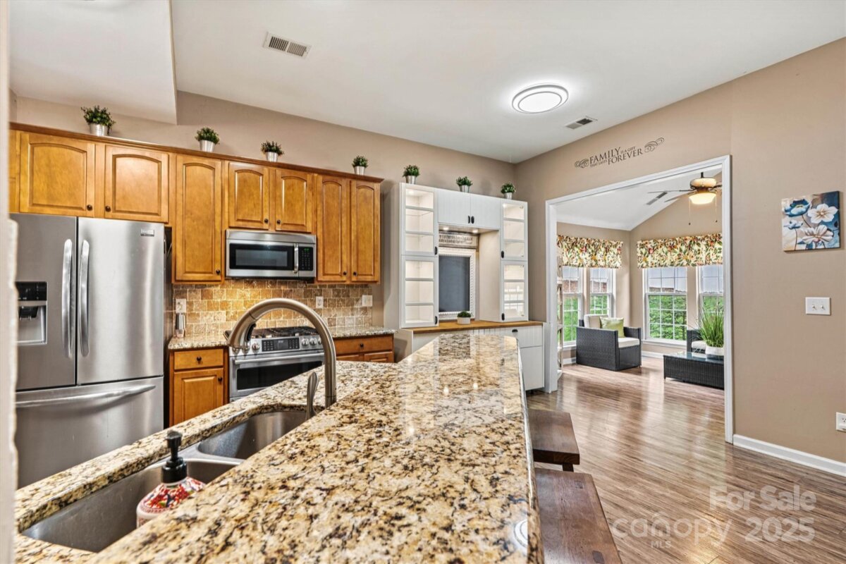 PRICE IMPROVEMENT!!!! Tucked away in a cul-de-sac in the desirable Smithstone community, this beautiful ranch-style home with a Finished Room Over Garage (FROG) offers the perfect blend of comfort, style, and functionality. With 3 bedrooms and 2.5 baths, the layout features a spacious primary suite on the main level, and a versatile bonus room ideal for guests or hobbies on the upper floor. The kitchen features a gas range, stainless steel appliances, and granite countertops, flowing into the great room and sunroom—creating an open, inviting space that's perfect for entertaining. Enjoy seamless indoor-outdoor living with a welcoming front patio, a fenced in backyard for privacy and play, and a covered back deck perfect for relaxing or entertaining year-round. Smithstone’s amenities include a pool overlooking Lake Norman, a clubhouse, and RV/boat storage. Conveniently located near two public boat launches, Beatties Ford Park with new beach access, and a variety of shops and restaurants—this home is perfect.